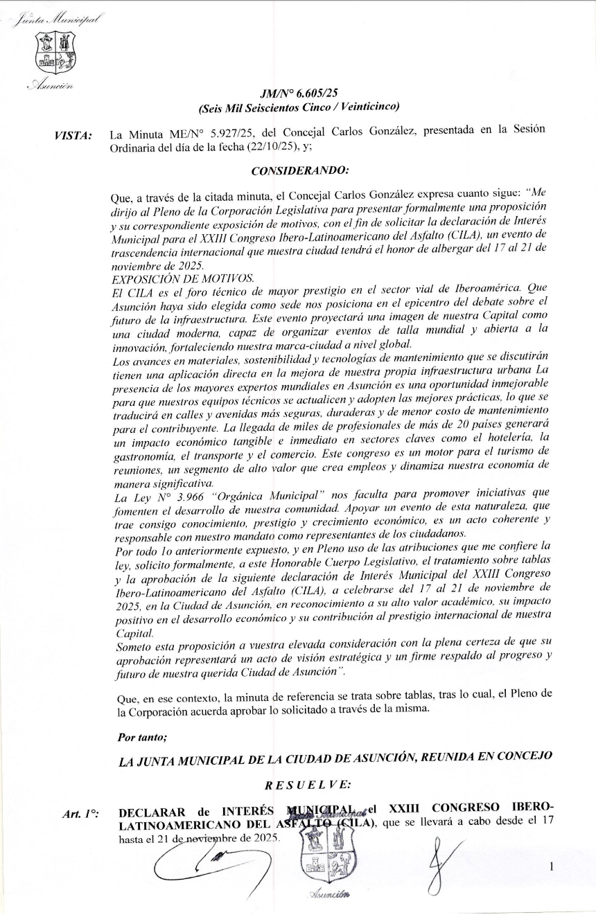 El XXIII Congreso Ibero-Latinoamericano del Asfalto (CILA) ha consolidado su relevancia al obtener la Declaración de Interés Municipal (JM/N° 6.605/25)por parte de la Junta Municipal de Asunción. La resolución fue aprobada en la Sesión Ordinaria del 22 de octubre de 2025 , asegurando el respaldo oficial de la ciudad sede al evento que se llevará a cabo del 17 al 21 de noviembre de 2025.